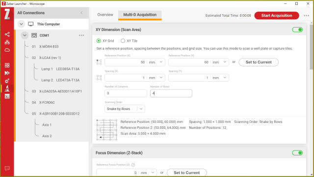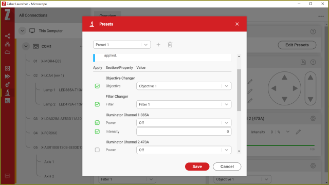 What You Will LearnYou will see how to select the Zaber devices that comprise your microscope and assign their roles in the software, and how to control them interactively.